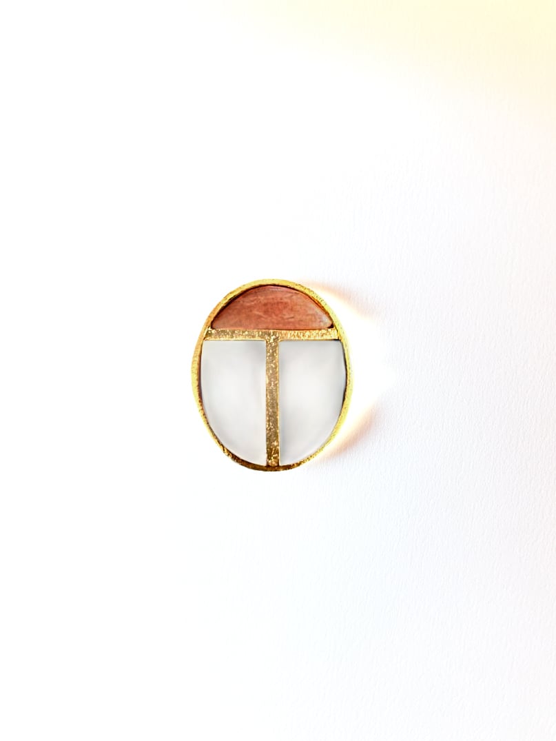 Une bague gri-gri parfaite. Le motif scarabée, très équilibré, donne à cette bague une présence singulière. Son dessin ovale, structuré par de fines lignes dorées, met en valeur le contraste délicat entre la nacre et la douceur de la pierre de lune. La lumière joue ici de façon subtile. La nacre apporte ses reflets laiteux et changeants, tandis que la pierre de lune pêche / beige clair introduit une tonalité plus veloutée, presque chair.