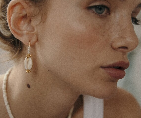 – L’attache de chaque bijou est de type semi-créole, dotée de fermoir “poussoir”. Cette créole ouverte est ornée de perles magnésite. Le Cauri est suspendu à cette dernière.