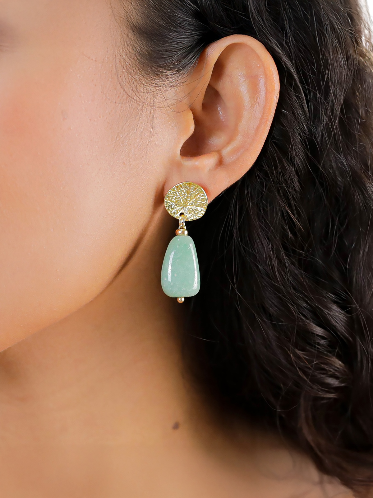Portez facilement vos boucles d’oreilles aventurine sur une encolure dégagée ou avec les cheveux relevés, pour laisser apparaître le contraste entre le disque doré et le vert adouci de la pierre.