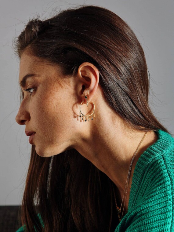 - Des boucles d’oreilles de créateur en forme de petites créoles. De fines pampilles les rehaussent. Elles se terminent par de délicats zircons noirs.