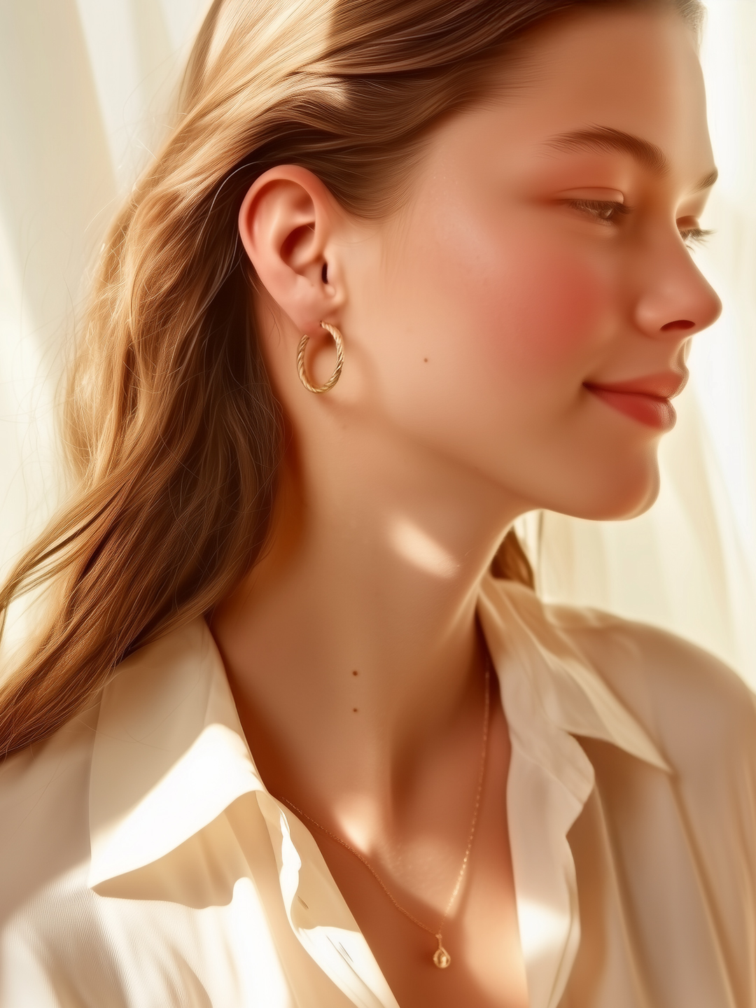 Les Créoles torsadées Sibyl présentent un subtil jeu de fils enroulés. L’un est plat, l’autre torsadé.