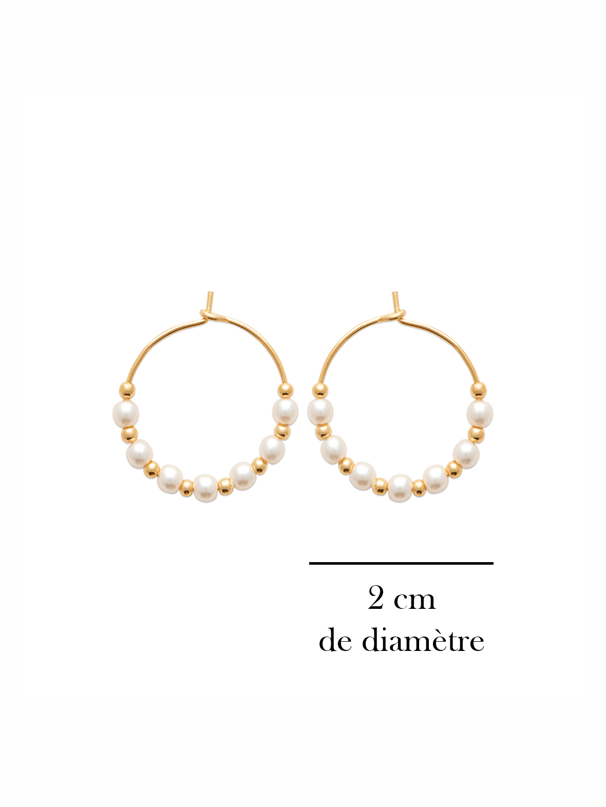 Légères comme une touche de lumière, les petites créoles perles plaqué or Oia misent sur l’essentiel : un fil fin respectueux de la peau, une ronde de 7 mini perles d’imitation nacrées et 8 petites billes intercalaires dorées, qui rythment la boucle.