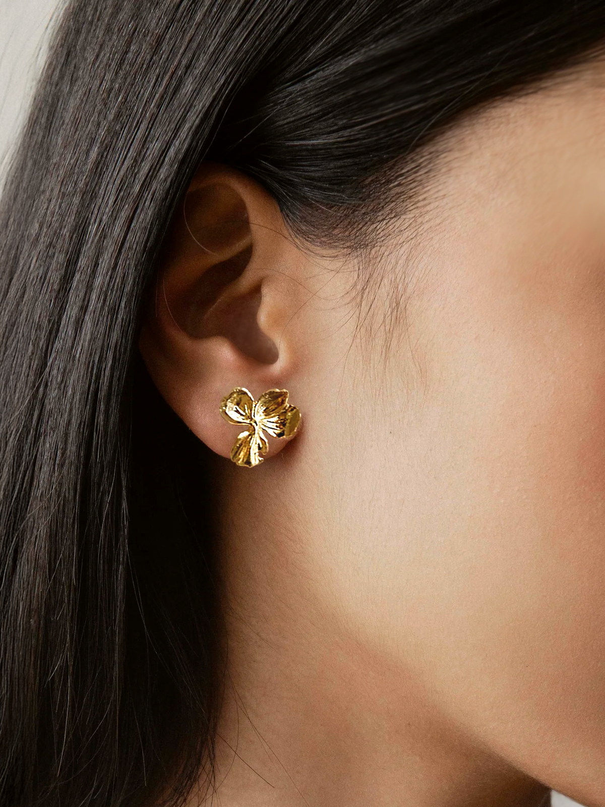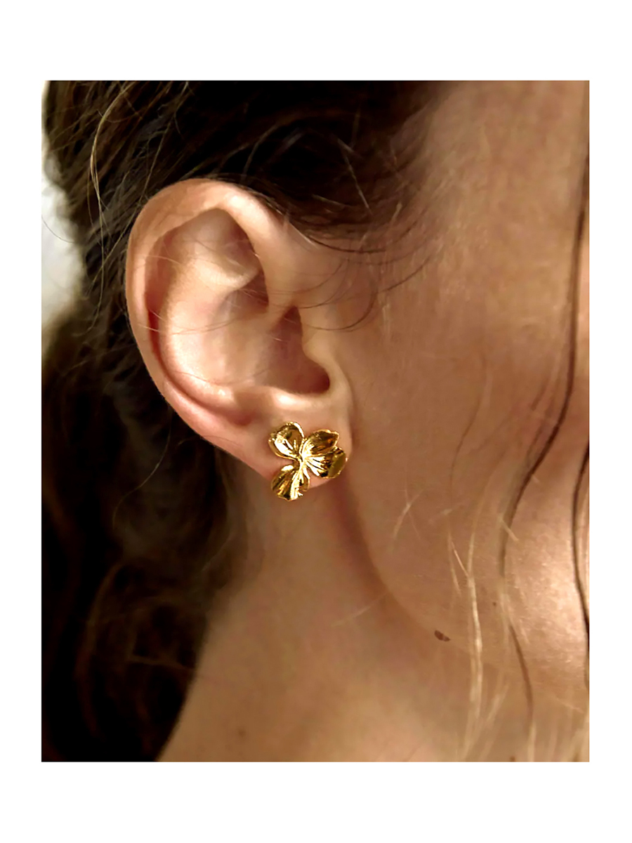 Ces boucles d’oreilles dorées jouent sur des pétales légèrement texturés, aux contours irréguliers. Ils accrochent la lumière et créent de subtils reflets à chaque mouvement de tête. Un format suffisamment discret et singulier, pour signer habilement une silhouette.