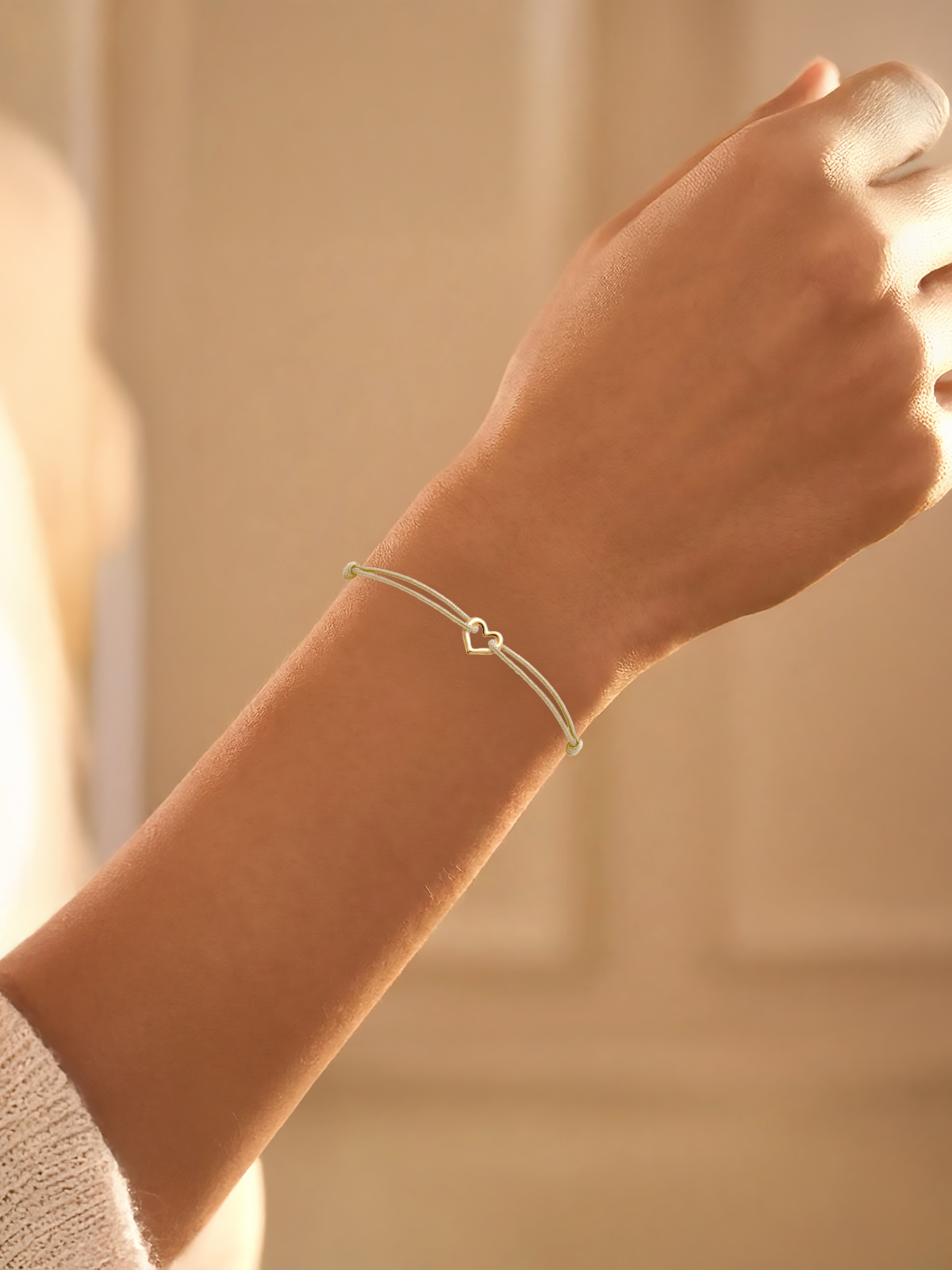 Le bracelet cœur plaqué or cordon beige en détail