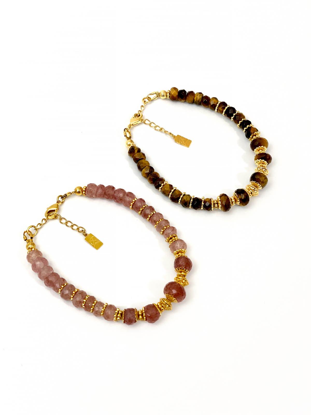 Découvrez le ravissant Bracelet en pierres naturelles Strawberry Quartz Alba. Une merveille. Nous aimons le jeu de couleurs autour des pierres, dans de subtils camaïeux de couleurs. Cette création présente un esprit bohème, non figé.