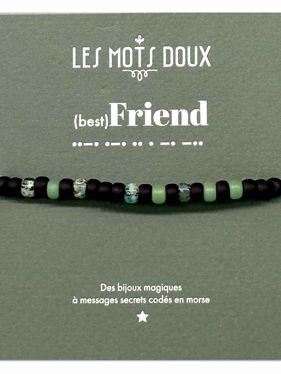 - Le dessin formé par l’alternance des perles révèle un mot codé en morse. Seule la personne portant ce bijou connait la signification de ce message ((Best) Friend, en ce cas). Ainsi, plus qu’un bijou classique, vous avez une intention magique à offrir ou à vous offrir.