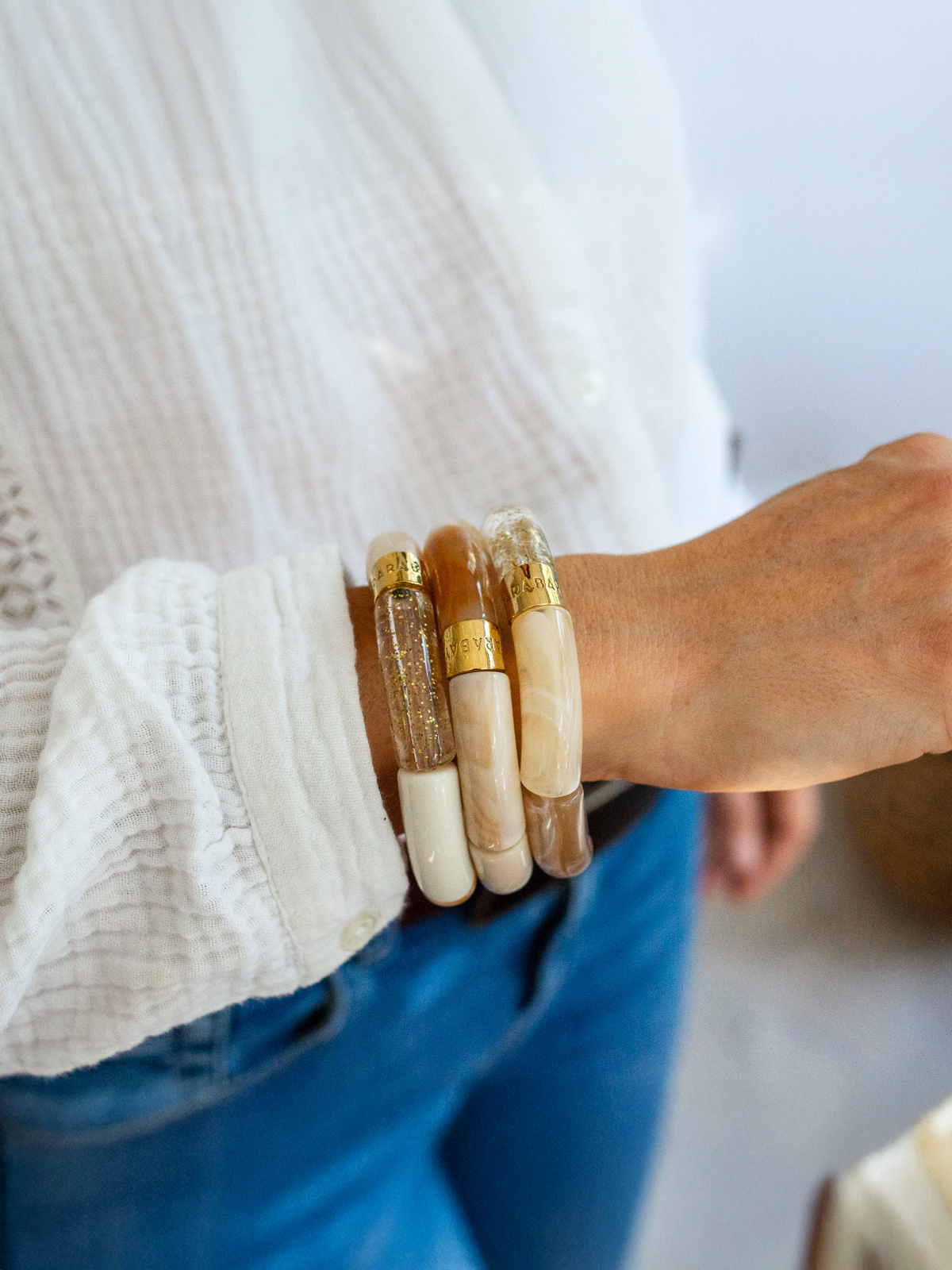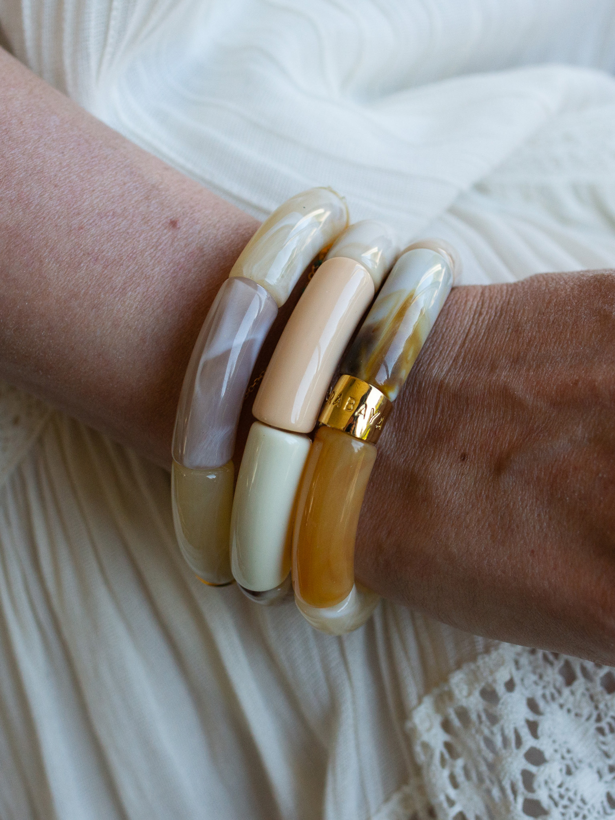 - Les perles : Les bracelets présentent 6 perles allongées en acrylique ou résine de très belle qualité. Une bague gravée PARABAYA en acier doré vient rehausser l’ensemble.