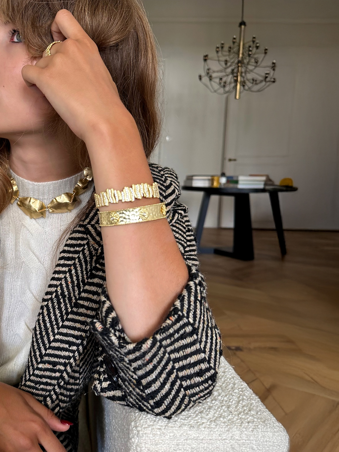 Dear Charlotte nous enchante à chaque collection. Découvrez le merveilleux Jonc doré strass Séquoia. Il présente un design audacieux, avec ses baguettes dorées, telles des dentelles lumineuses. De nombreuses clientes de Poisson Plume sont des inconditionnelles des bijoux originaux de cette belle marque : Nous aussi !