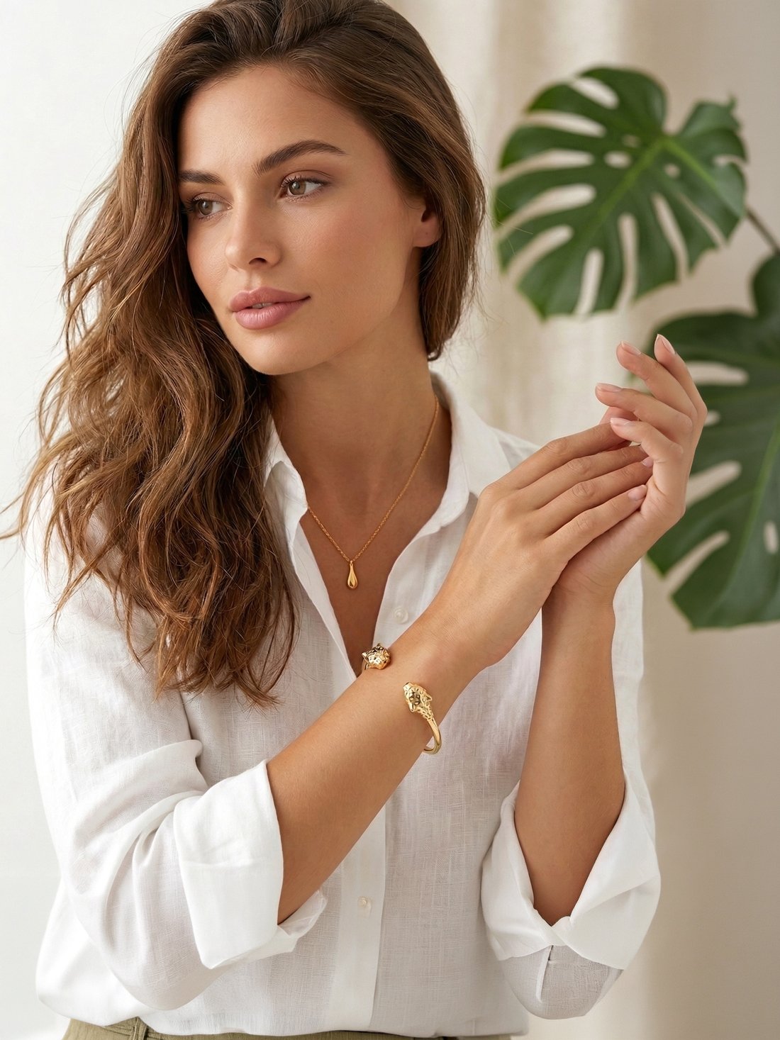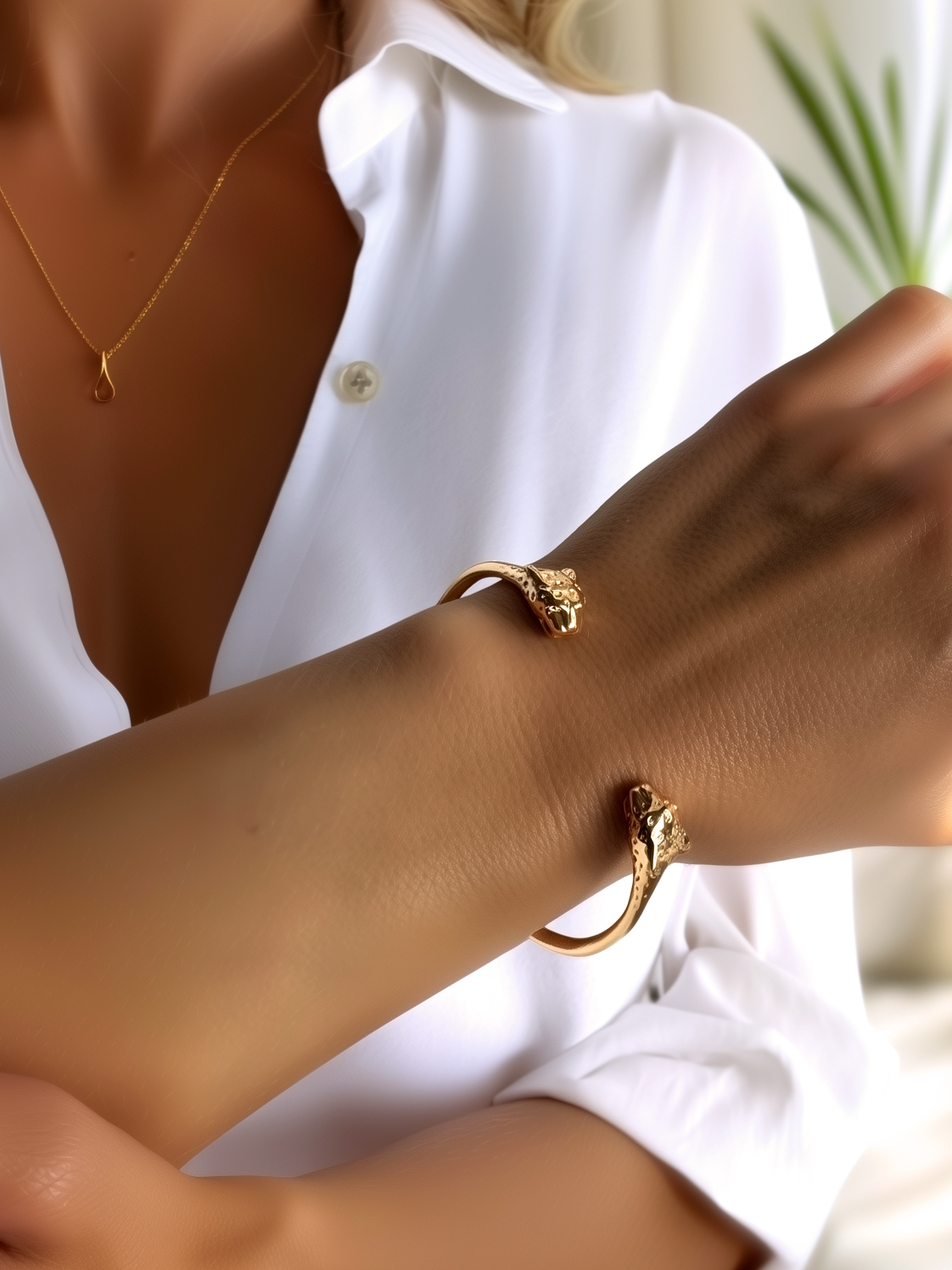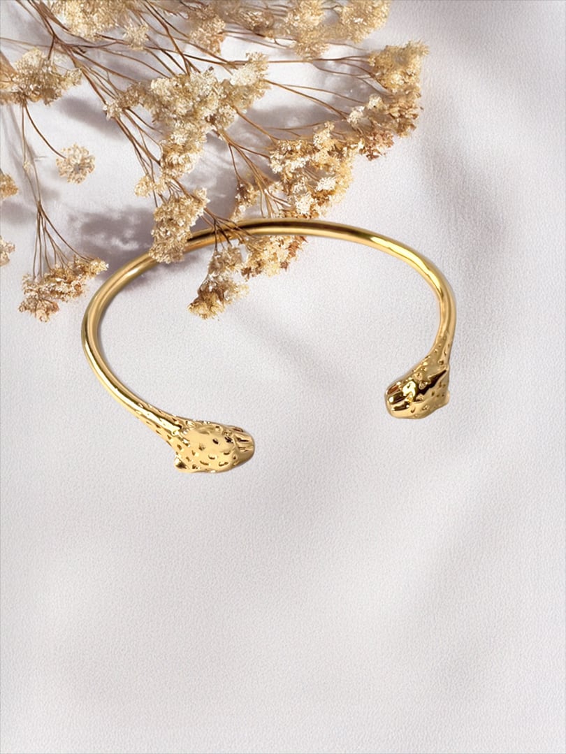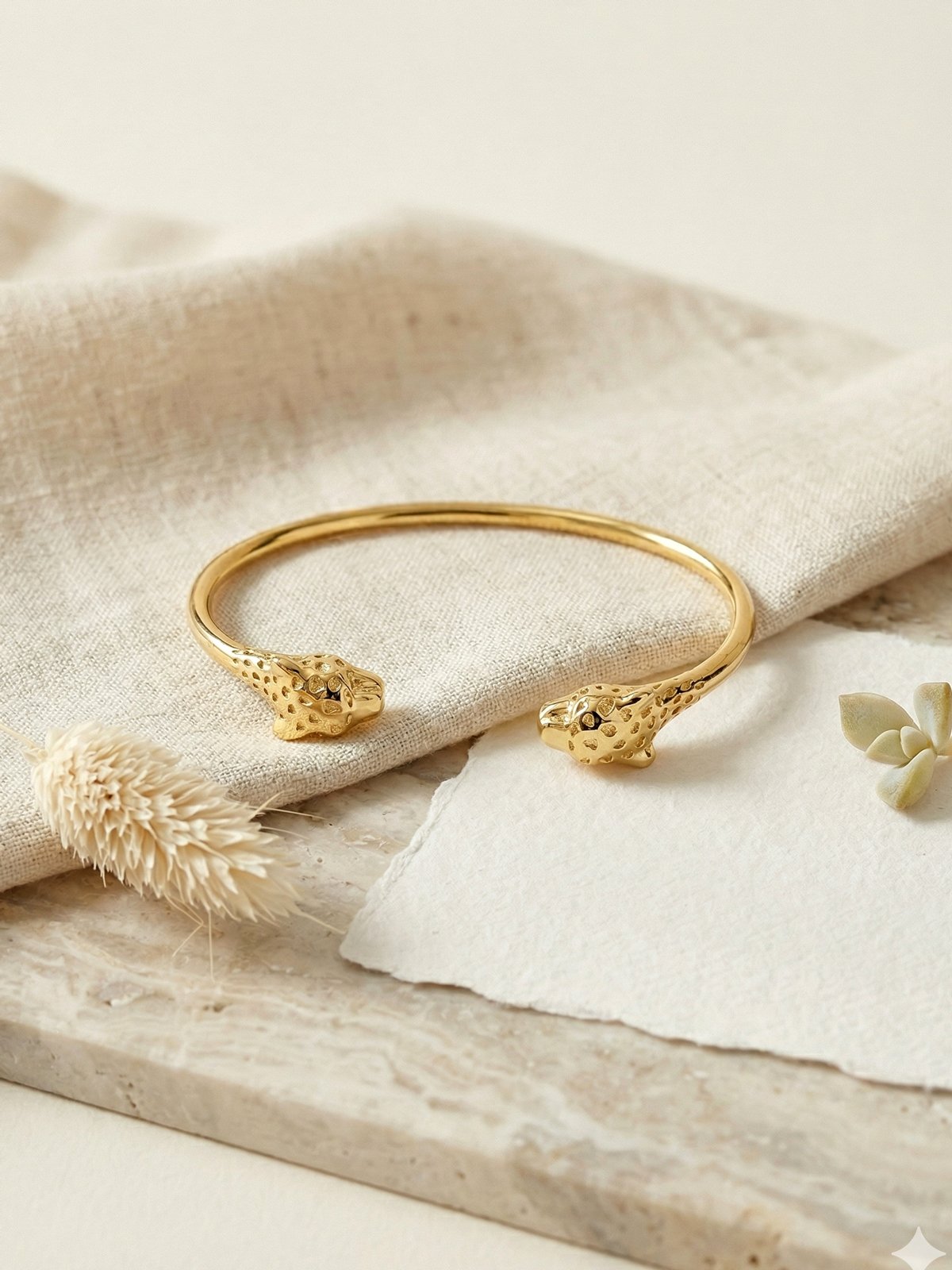 Félin, graphique, élégant : ce jonc panthère plaqué or Luna a ce charme des bijoux qui signent une allure à eux seuls. Deux têtes de panthère se font face et encadrent le poignet avec assurance, comme un petit talisman de force et de caractère.