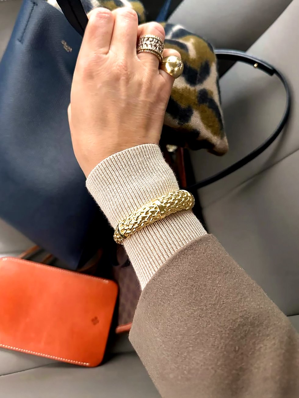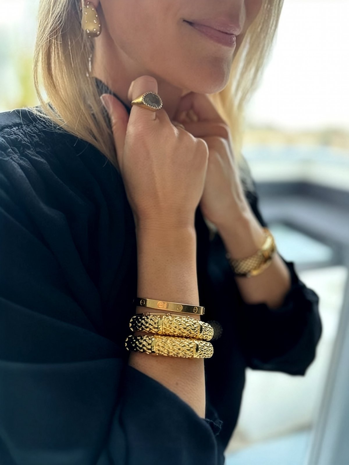 - Allure rétro-chic, pour ce jonc tressé doré, au beau tempérament. Vous êtes devant une excellente idée cadeau, très élégante.