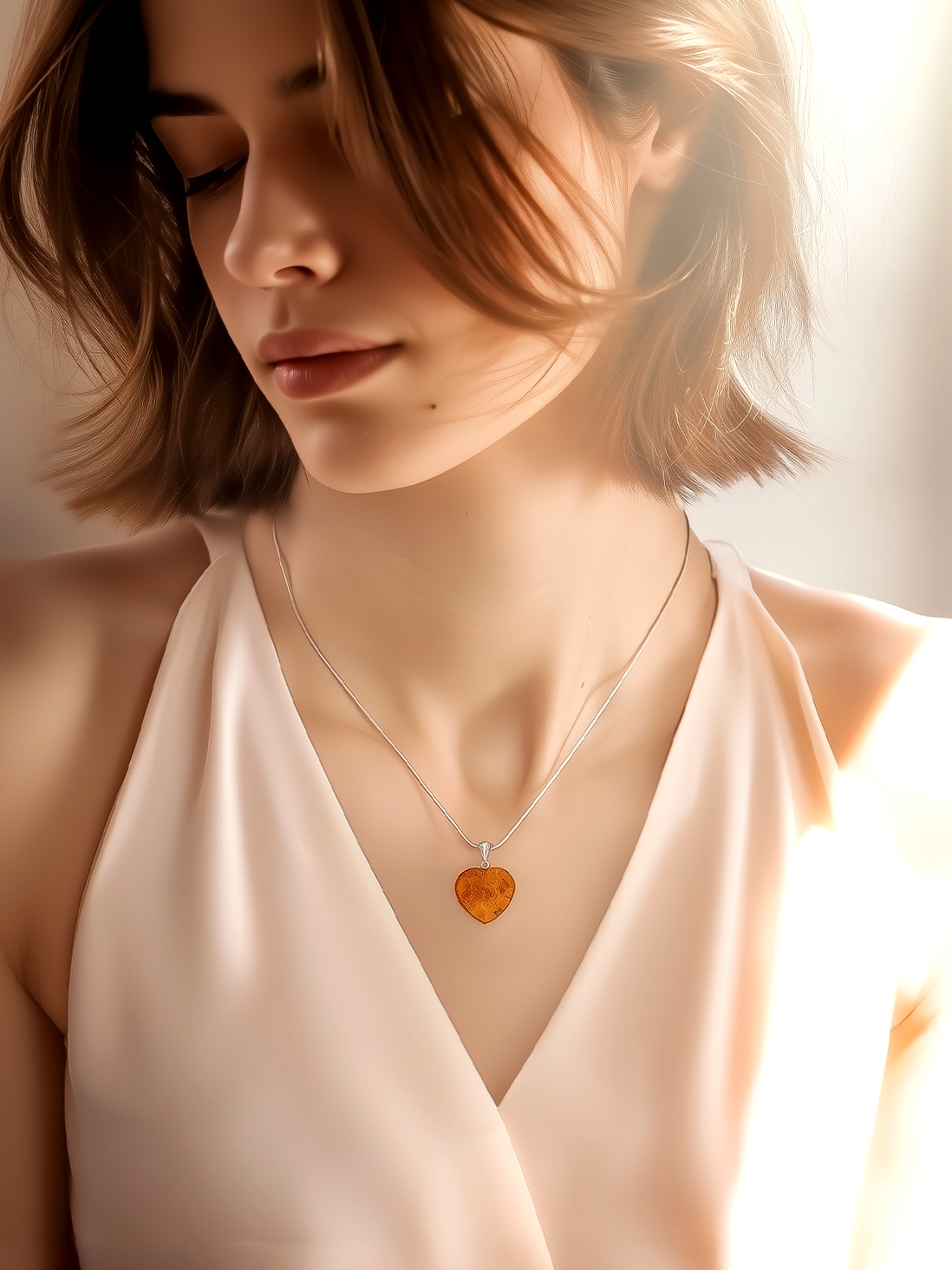 Bijou romantique délicieux, pendentif entre miel et cognac…. Voici le Collier Cœur d’ambre : Un trésor d’une grande élégance.
