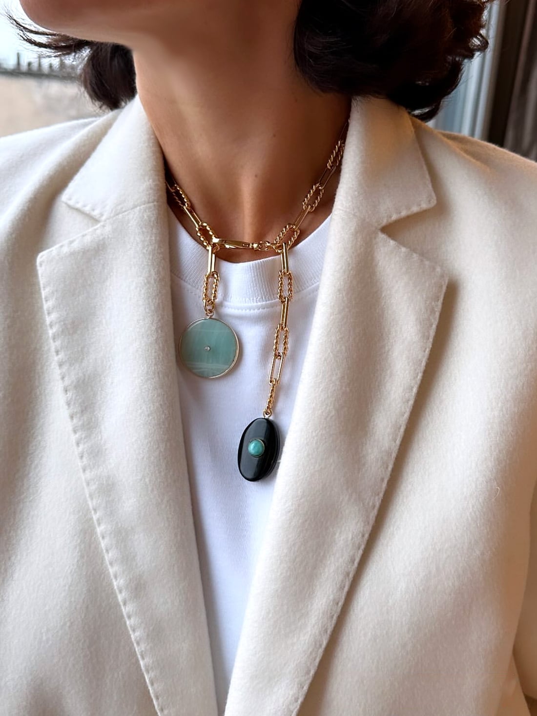 - On aime sa chaîne à grands maillons torsadés ovales et son merveilleux duo de couleurs, entre vert et noir.