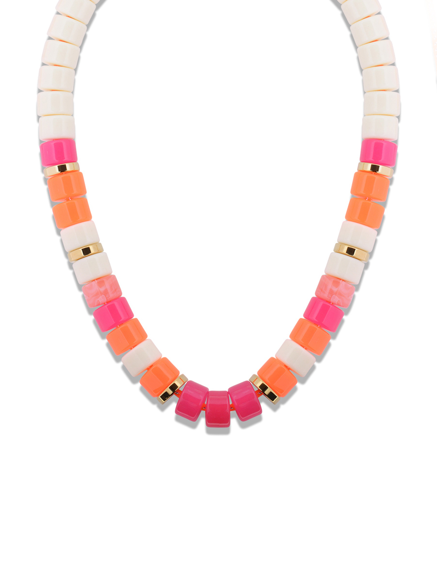 - Un Collier mêlant blanc crème et couleurs vives (orange, rose et vieux rose), monté sur un cordon.
