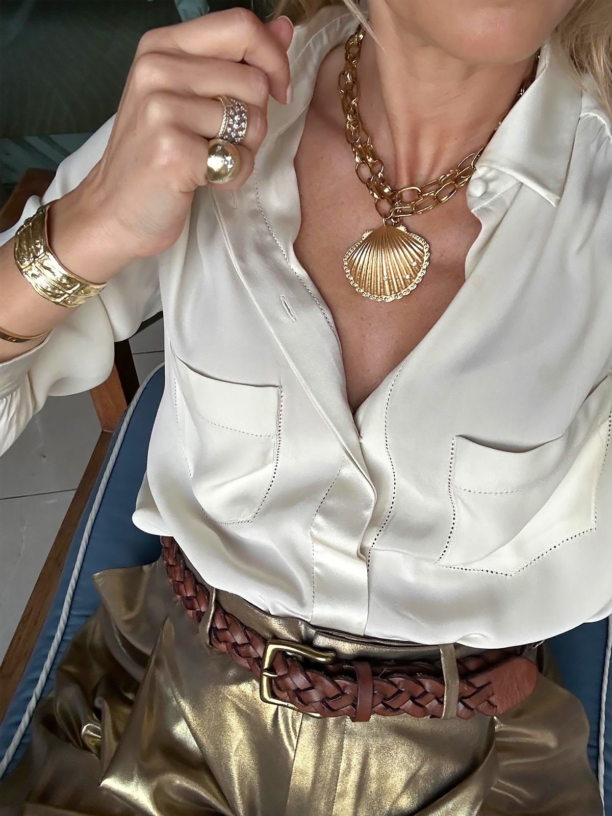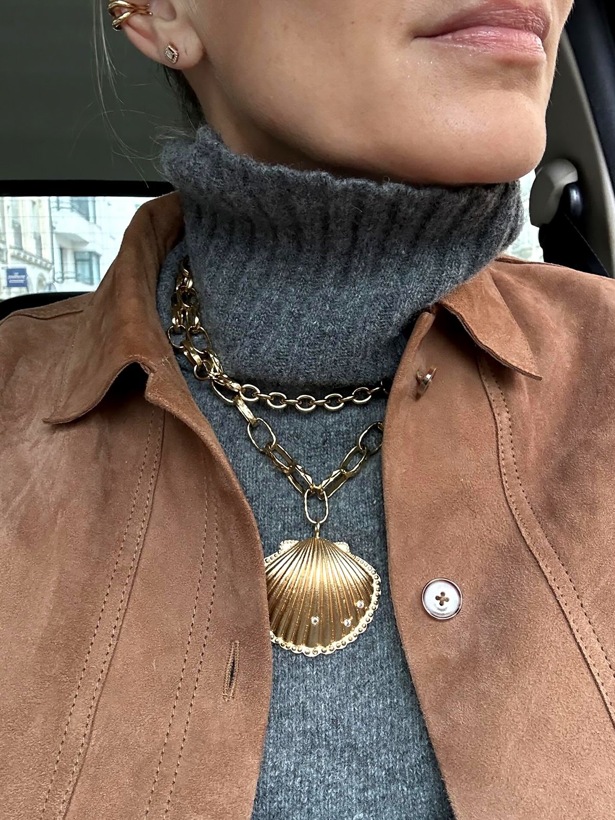 La chaîne, avec ses maillons allongés, structure le bijou. C’est un sautoir coquillage qui compose à lui seul une silhouette : sur une chemise ouverte, une robe, un tee-shirt ou une maille légère, il apporte une dimension habillée.