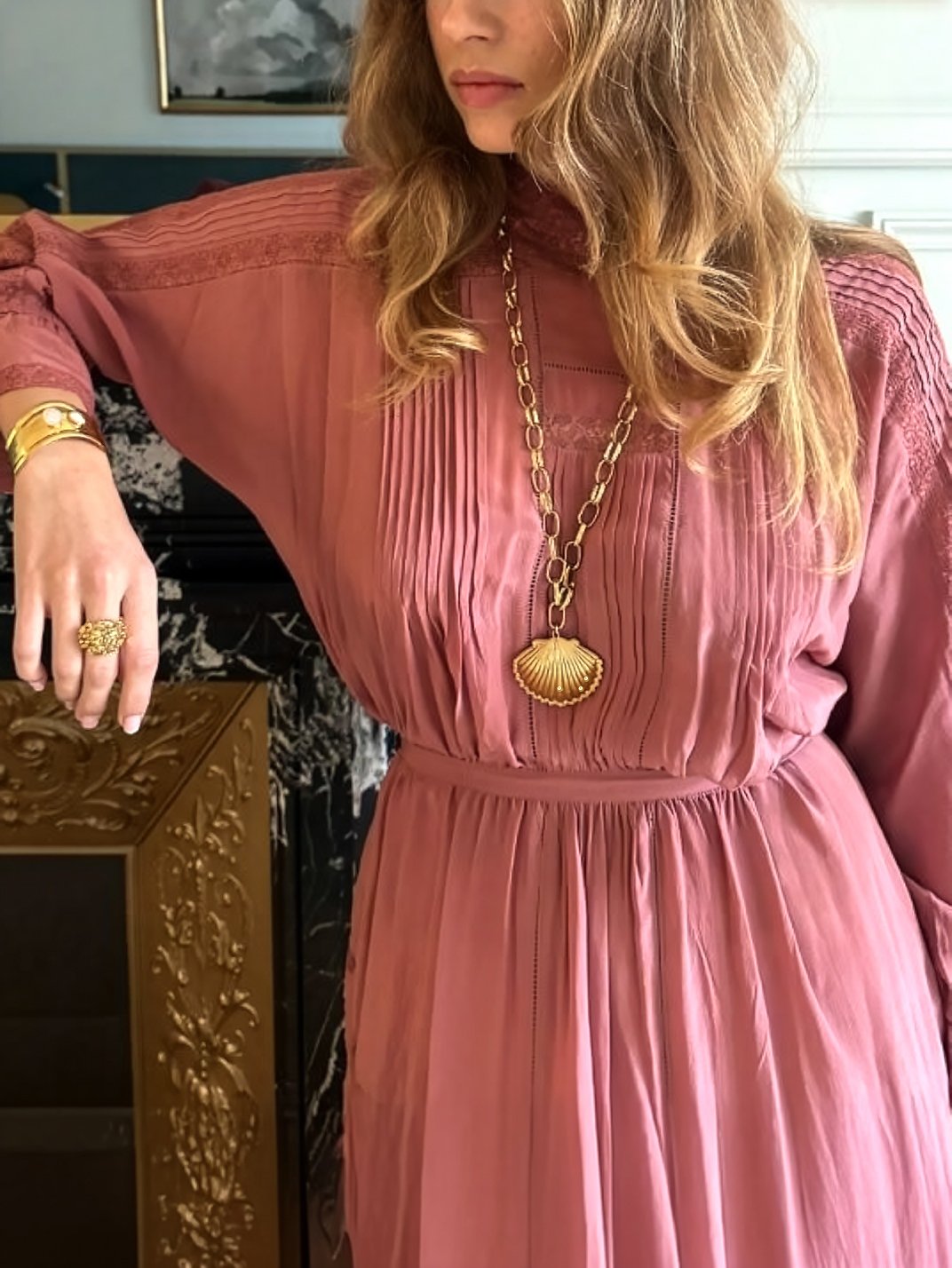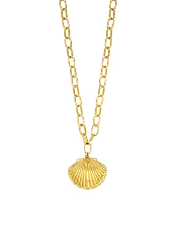 Depuis l’Antiquité, la coquille occupe une place singulière dans l’imaginaire décoratif occidental. Associée à Vénus, née de la mer dans la mythologie, elle traverse les siècles comme un motif à la fois symbolique et ornemental. On la retrouve dans les arts de la Renaissance, puis dans le vocabulaire décoratif des bijoux et accessoires : son dessin nervuré, rayonnant et presque architectural inspire des pièces féminines, souvent précieuses. Ici, Dear Charlotte en propose une interprétation stylisée, à l’allure rétro, entre évocation marine et sautoir coquillage de caractère.