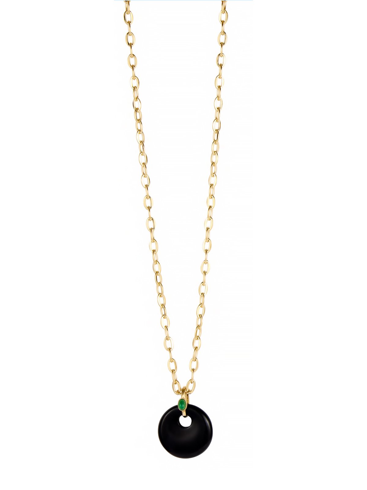 Le sautoir Onyx noir Eclipse de Virginie Berman repose sur un contraste particulièrement juste. D’un côté, la densité mate de l’onyx noir, taillé ici en grand pendentif rond ; de l’autre, la présence plus vive de la petite agate verte en cabochon. Monté sur une chaîne dorée à l’or fin à maillon medium, ce collier long a une vraie présence : il structure une silhouette tout en restant facile à porter.