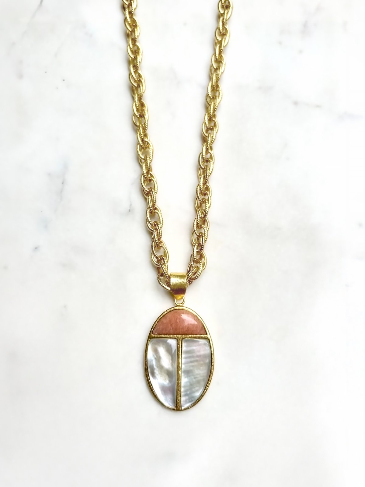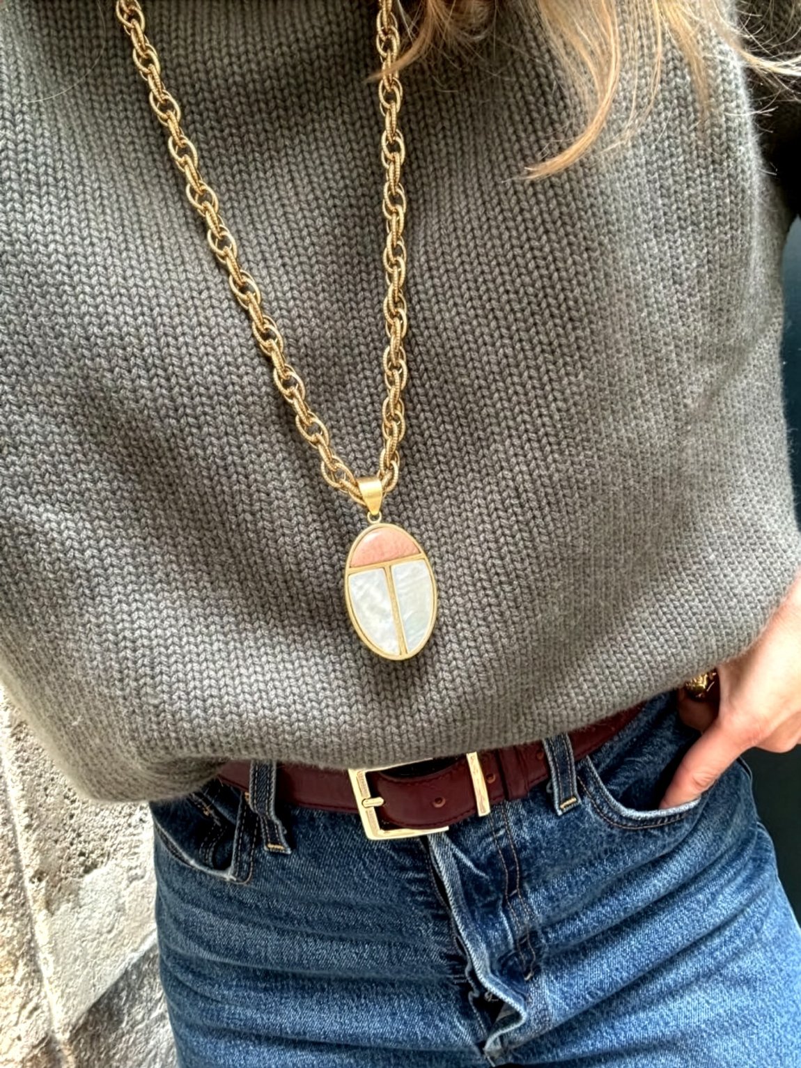 Quand le scarabée devient un véritable motif de bijou talisman, on adore ! Un ovale structuré, traversé de lignes dorées, des pierres naturelles parfaitement choisies… tout est parfait. La nacre apporte ses reflets laiteux, changeants, tandis que la pierre de lune pêche introduit une nuance plus tendre, plus veloutée, entre beige rosé poudré et abricot doux. Porté en sautoir, le scarabée prend encore plus de présence : il allonge la silhouette, habille facilement toute tenue.