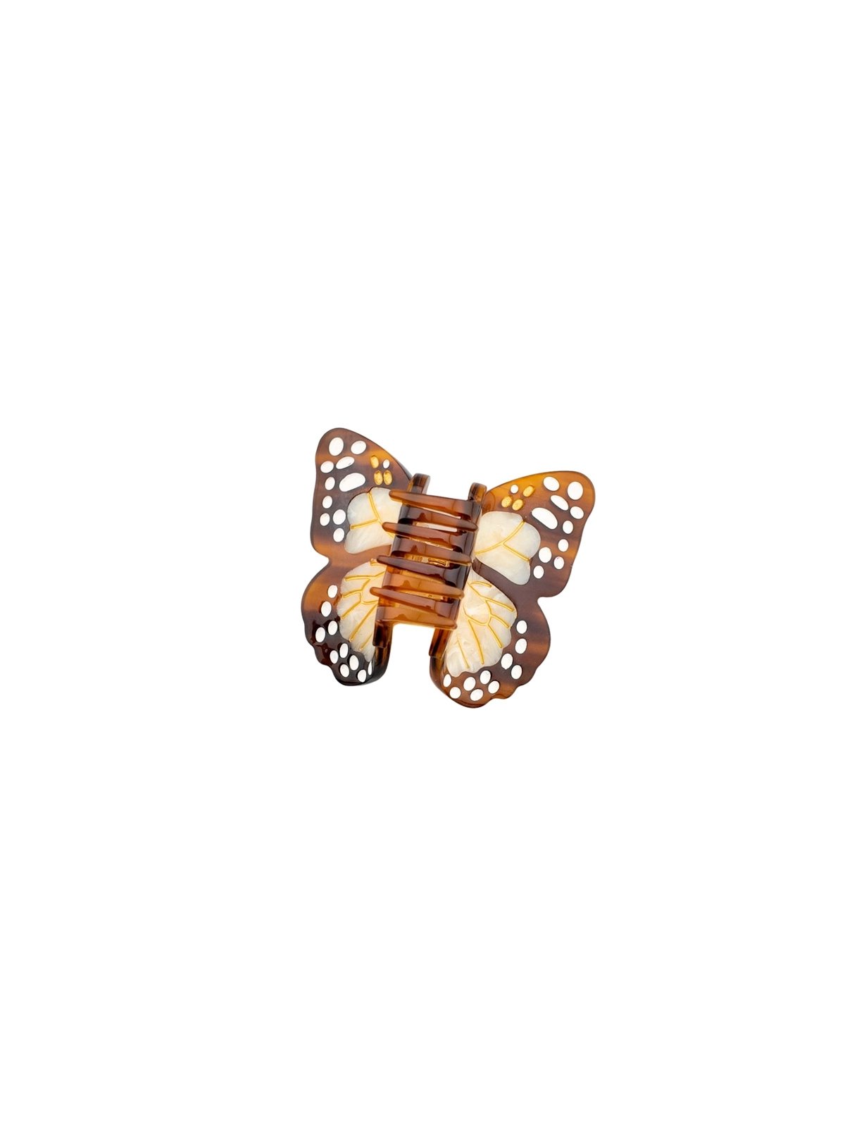 La Petite pince à cheveux papillon marron Solar Eclipse adopte une silhouette délicate, presque aérienne, mais avec une vraie présence dans les cheveux. Ses ailes brun ambré, ponctuées de touches ivoire, évoquent l’élégance légère d’un papillon sans tomber dans l’ornement trop sage. Le dessin est fin, lisible, et apporte immédiatement du relief à la coiffure.