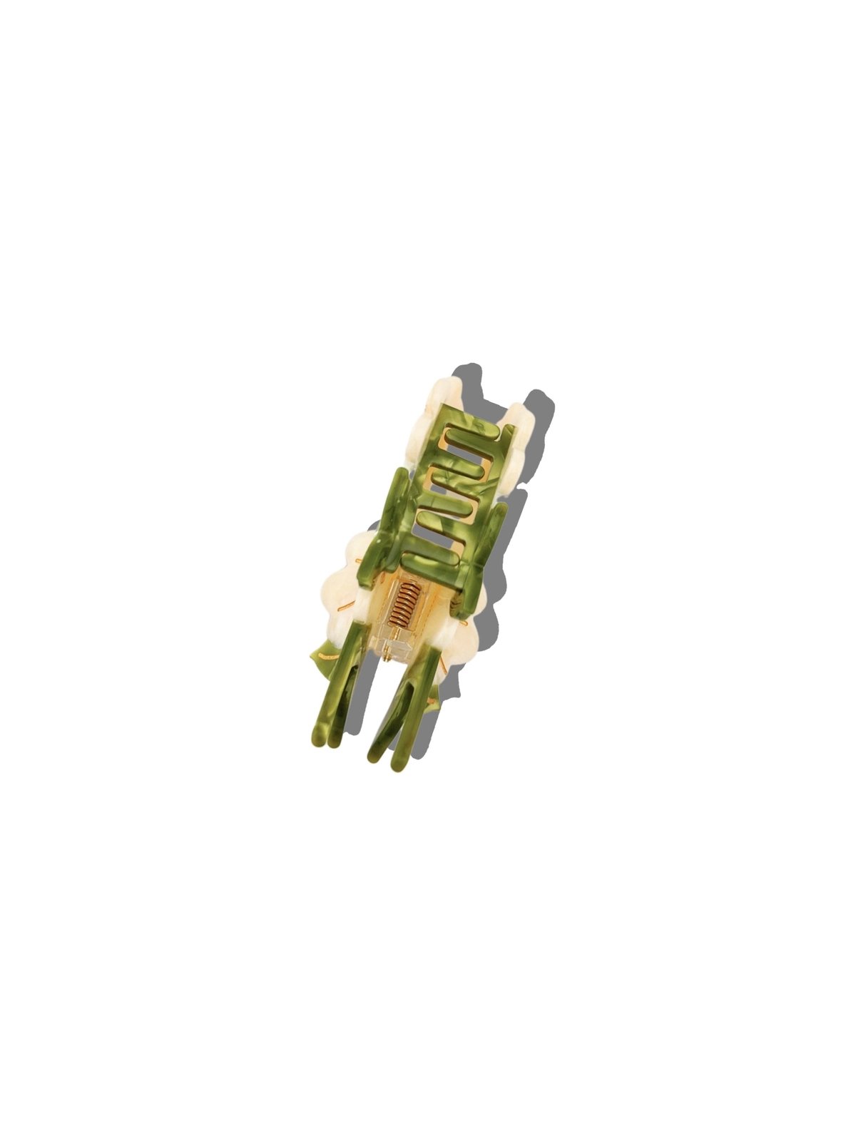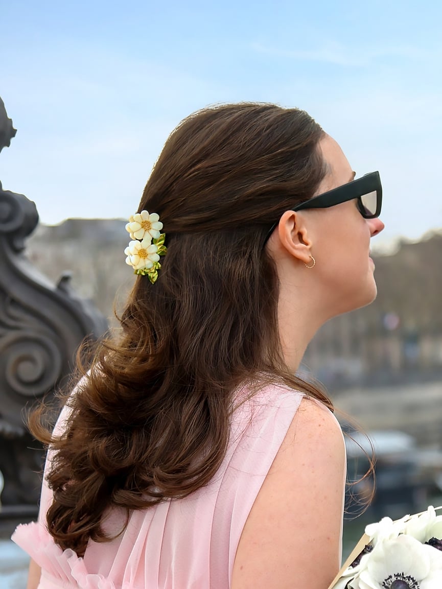 La pince à cheveux Tiges de marguerites Solar Eclipse compose une silhouette florale poétique. Deux fleurs ivoire au cœur solaire, quelques feuilles vert tendre, une ligne suivant naturellement le mouvement des cheveux : l’ensemble a quelque chose de frais et de parfaitement dessiné. C’est une pièce qui évoque le printemps été, bien sûr, mais avec suffisamment de structure pour dépasser l’effet saisonnier.