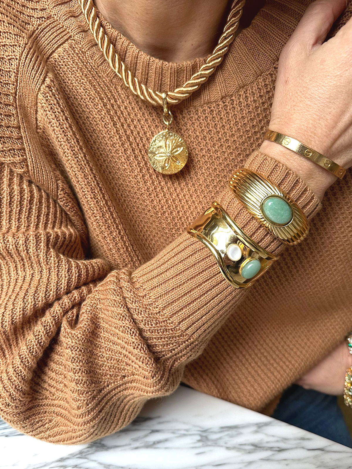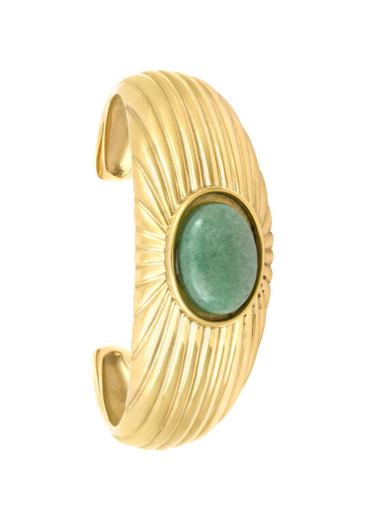 Découvrez cette saison le Jonc Strié aventurine Ondine. Son design réchauffera votre peau. On aime autant sa pierre fine naturelle que ses rayons de soleil en empreinte, sur le jonc large.
